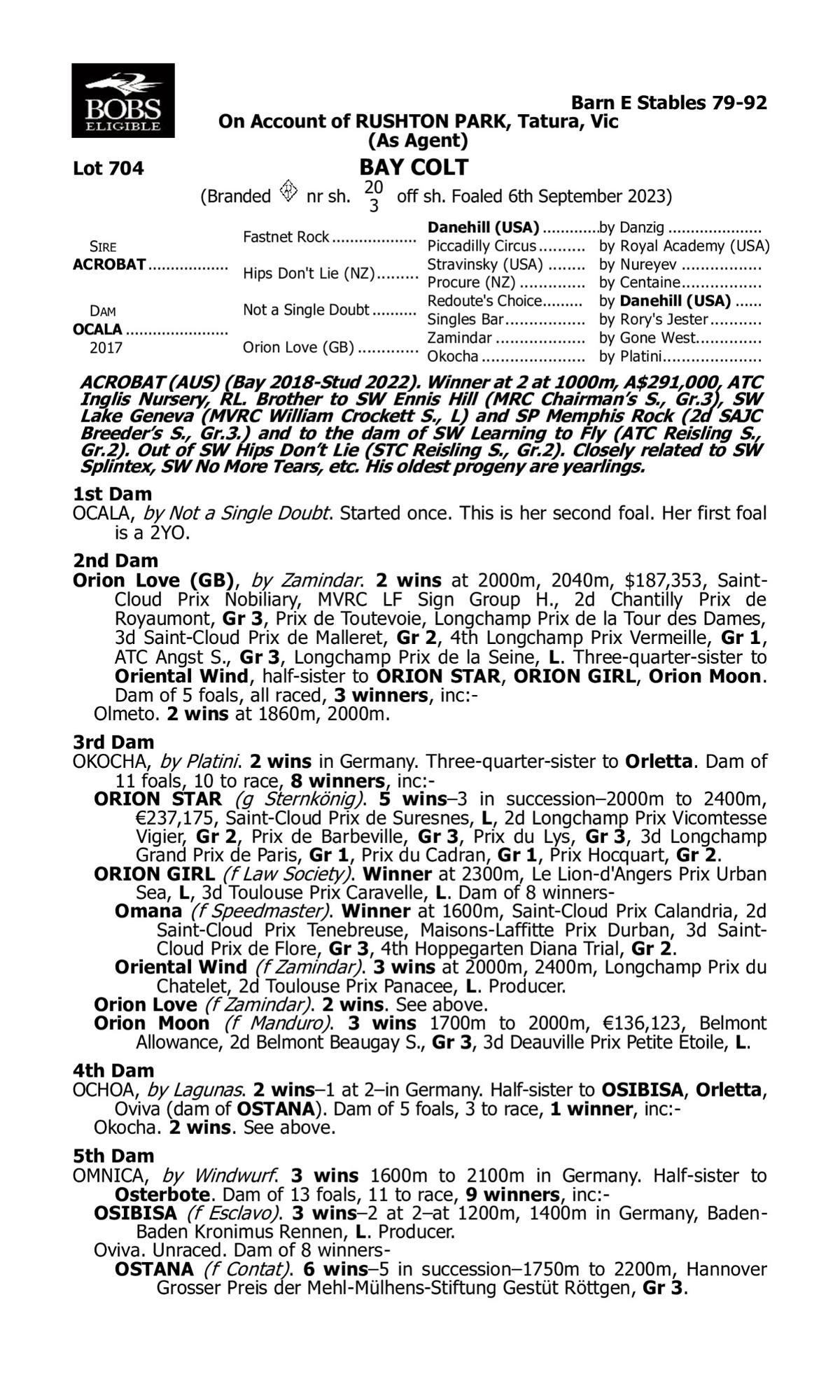 A son of the great FASTNET ROCK, ACROBAT was "The Fastest 2YO Ever at Randwick Over 1000m" and an "Unbeaten Stakes-Winning 2YO" before his career was unfortunately cut short due to injury.